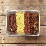 Organic scrambled eggs, Niman ranch bacon, organic rosemary roasted potatoes, organic roasted tomatoes and toasted baguette.