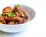 (serves 10-12) Gluten-free crispy tofu with onions and bell peppers in our tangy orange sauce, garnished with green onions. (GF, V)