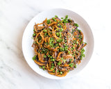 (serves 8-10) Pan roasted butternut squash noodles with spring peas, jackfruit, crimini mushrooms, green peppers, fresh ginger, topped with salt-free peanuts. (GF, V)