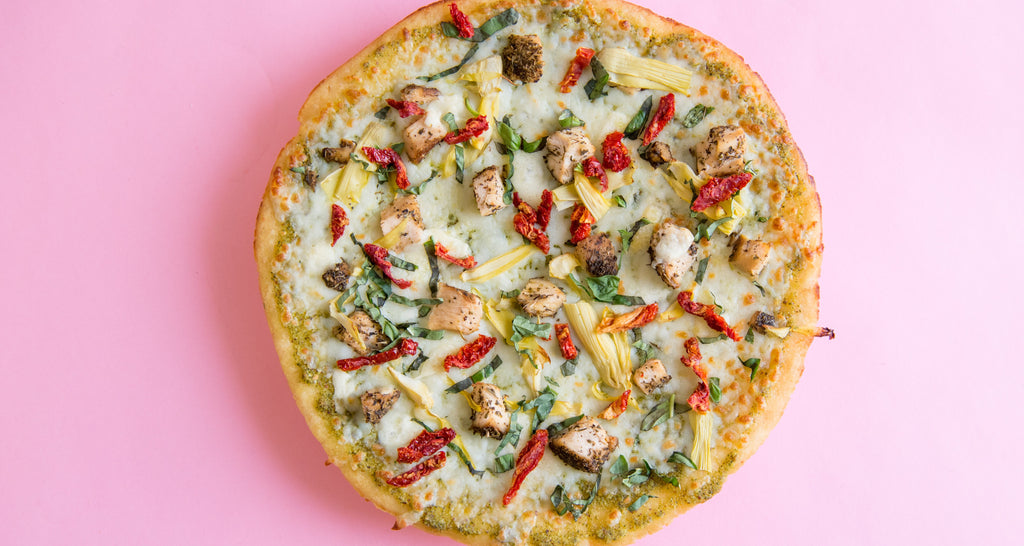 Gluten Free, Vegan Cauliflower Based Crust decoratively built with fresh artichokes, sun-dried tomatoes, grilled chicken, part skim mozzarella cheese, chiffonade basil, finished with shaved Romano cheese with our almond based pesto sauce